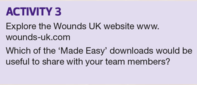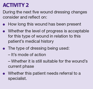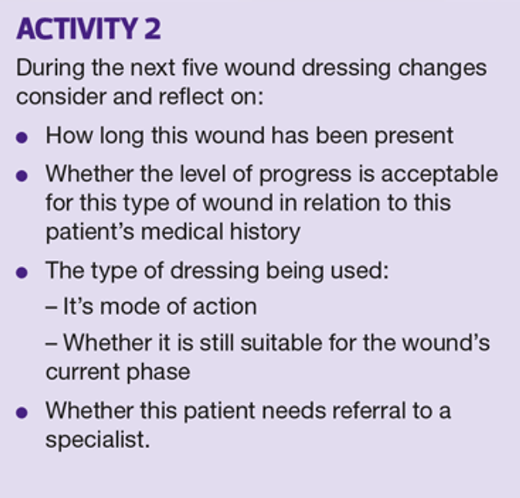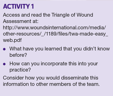 To facilitate correct dressing selection a full, holistic assessment is required. Any underlying pathophysiological factors need to be addressed prior to progressing onto wound-specific information gathering. Patient concordance also needs to be considered. Different wound assessment frameworks allow a structured, effective and thorough wound appraisal. (See Activity 1) The main areas focus on determining the wound aetiology and any systemic factors that impact wound recovery, wound assessment and the status of the skin around the wound.7