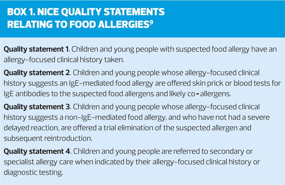 1. NICE CG116. Food allergy in under 19s: assessment and diagnosis, 2011.