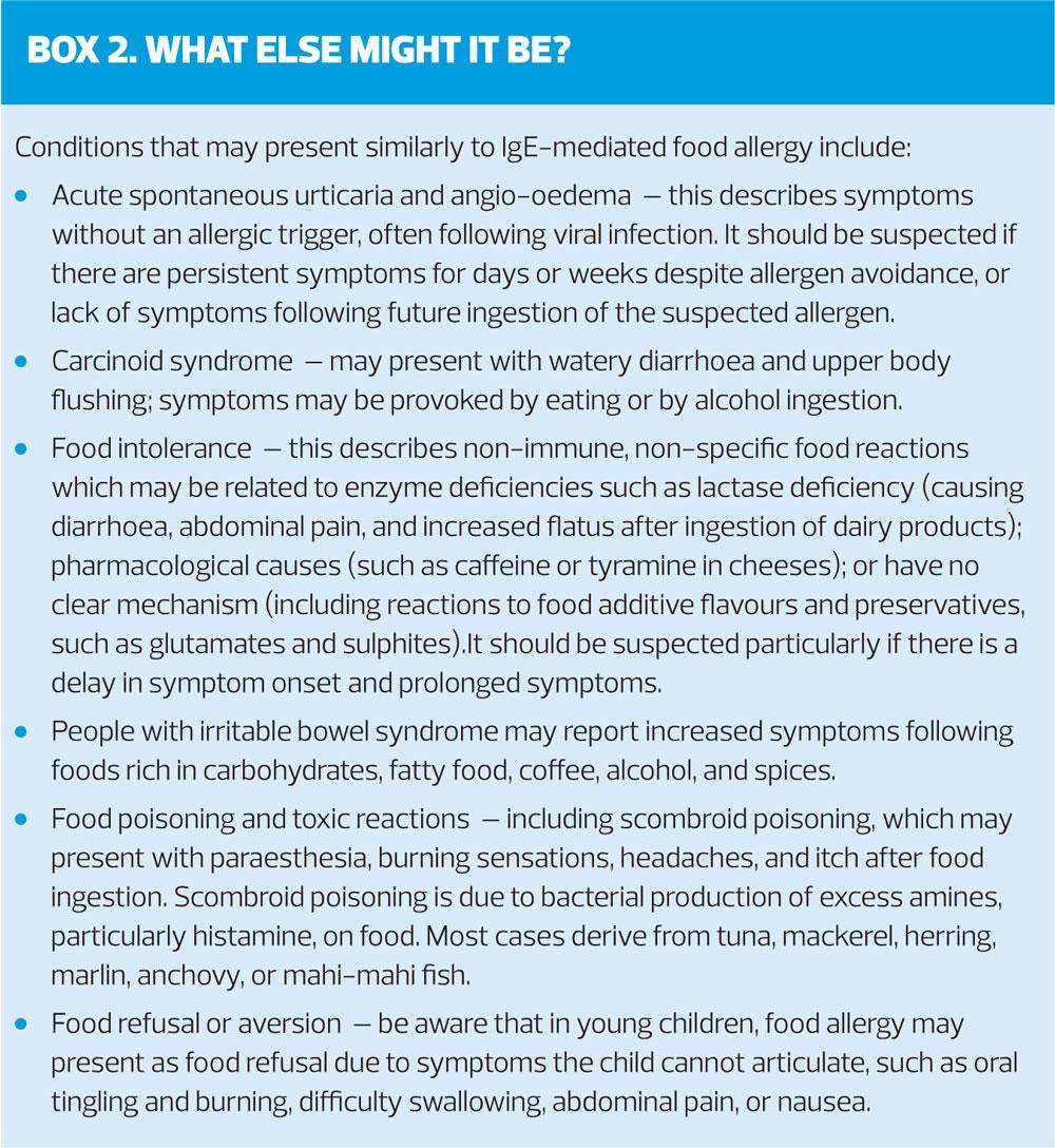 Food allergies affect around 2% of children in the UK, and rather fewer adults. The typical symptoms, including anaphylaxis, are clearly distinguishable from other diagnoses such as food intolerance, food poisoning and irritable bowel syndrome. Less typical presentations may require food diaries, more detailed assessment and referral for allergy testing.