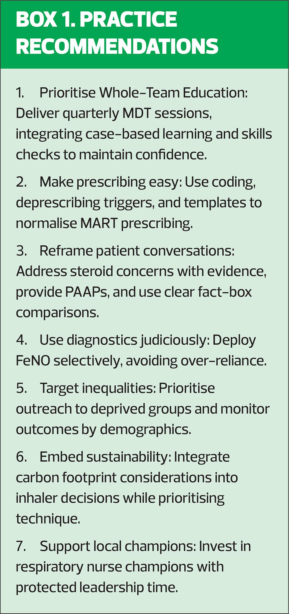 Historically, variations in guideline recommendations created uncertainty among clinicians. However, recent harmonisation strengthens confidence. BTS/SIGN/NICE and GINA both now recommend MART and strongly advise against SABA-only treatment.4,5 This consensus reduces ambiguity and provides a clear mandate for practice change, aligning clinical practice with national safety and quality priorities. For practice nurses, this convergence legitimises advocacy for MART in multidisciplinary discussions and provides a foundation for leadership in local implementation.