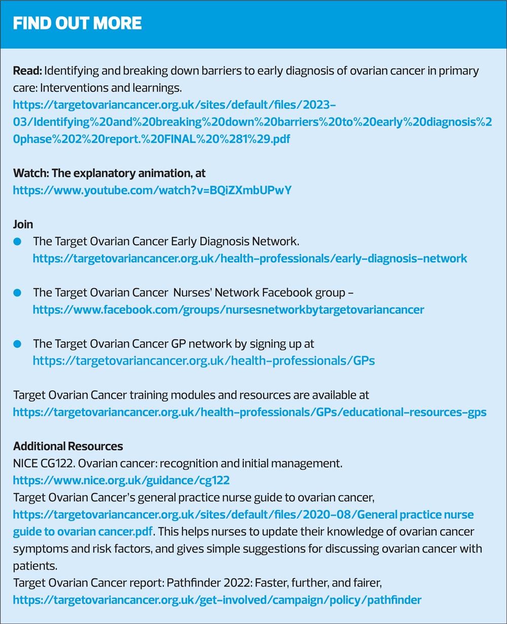 6. Target Ovarian Cancer (2023) Identifying and breaking down barriers to early diagnosis of ovarian cancer in primary care: Interventions and learnings; 2023 https://targetovariancancer.org.uk/breaking-down-barriers-early-diagnosis-ovarian-cancer