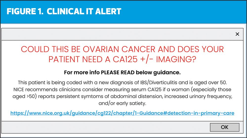To support GPs to consider ovarian cancer, we tested an IT alert that comes up on screen (with advice to test CA125 and review NICE guidance) when a woman over 50 is coded with a new diagnosis of IBS or diverticulitis and there has been no recent CA125 (Figure 1).