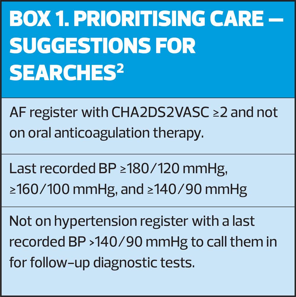 While usual provision of care is limited because of the pandemic, it is essential to work in smart ways by stratifying care and prioritising those at most risk, such as the patients with the highest recorded BP. Search strategies for EMIS and SystmOne have been developed to identify those at high risk in primary care and these resources are freely available.2 Simple searches as illustrated in Box 1 can be used to direct reduced services to those who are at most risk. Searching for and contacting patients with poorly controlled blood pressure is an example of this approach. Opportunistic screening of hypertension can continue through searching for patients with no code of hypertension but a recorded clinical BP greater than 140/90 mmHg and arranging relevant investigations to confirm or refute hypertension.