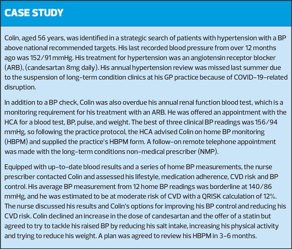 As a response to reduced patient contact due to the pandemic, HCPs are encouraged to try and get the most out of each patient encounter, whether face to face or remote, and offer opportunistic screening, monitoring and management of CVD risk factors and condition. If patients are attending for bloods, ECG or dressings then this provides an opportunity to check pulse and blood pressure and to enquire about lifestyles.2 A same day telephone triage appointment for a minor aliment could be a chance to carry out an overdue hypertension review remotely and the patient could be asked to supply some home blood pressure monitoring results.