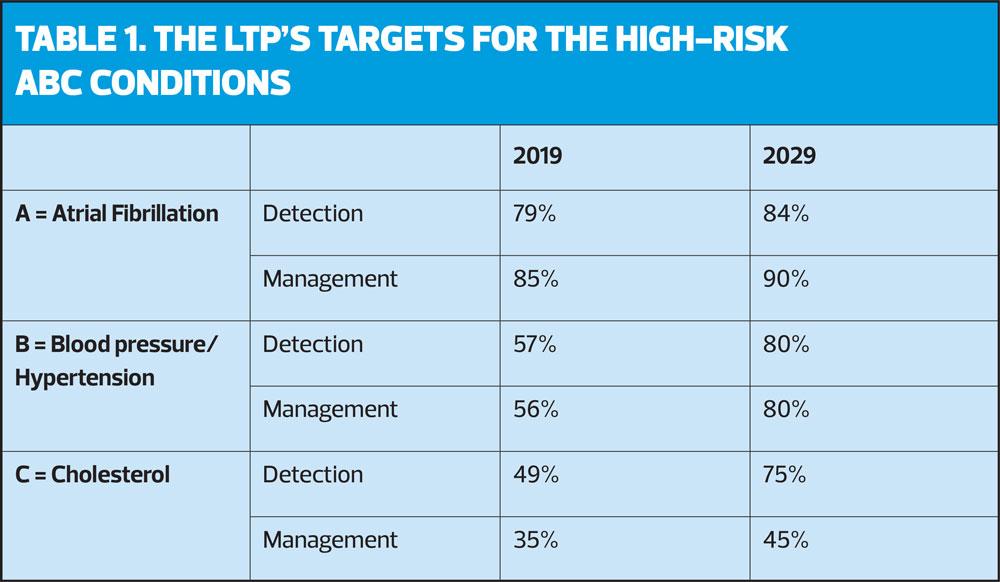 CVD is largely preventable, and the biggest gains can be achieved through primary prevention initiatives, which target individuals without existing disease and promote healthy lifestyle choices and which identify risk factors and high-risk conditions. The LTP strategy for prevention focuses on identifying and treating the three ‘ABC’ high-risk conditions – Atrial Fibrillation (AF), Blood pressure and Cholesterol (Table 1).