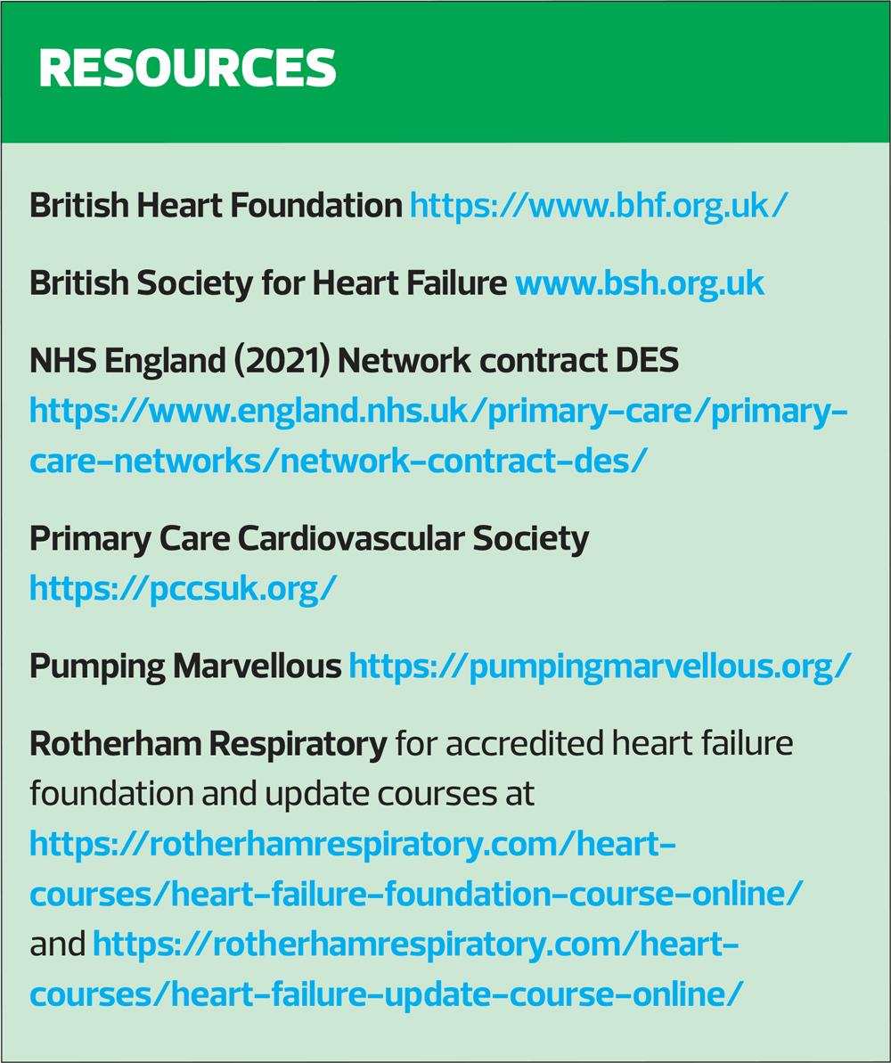 Close collaboration with the local heart failure specialist nurse and community heart failure team will ensure GPNs are supported in all aspects of heart failure management.
