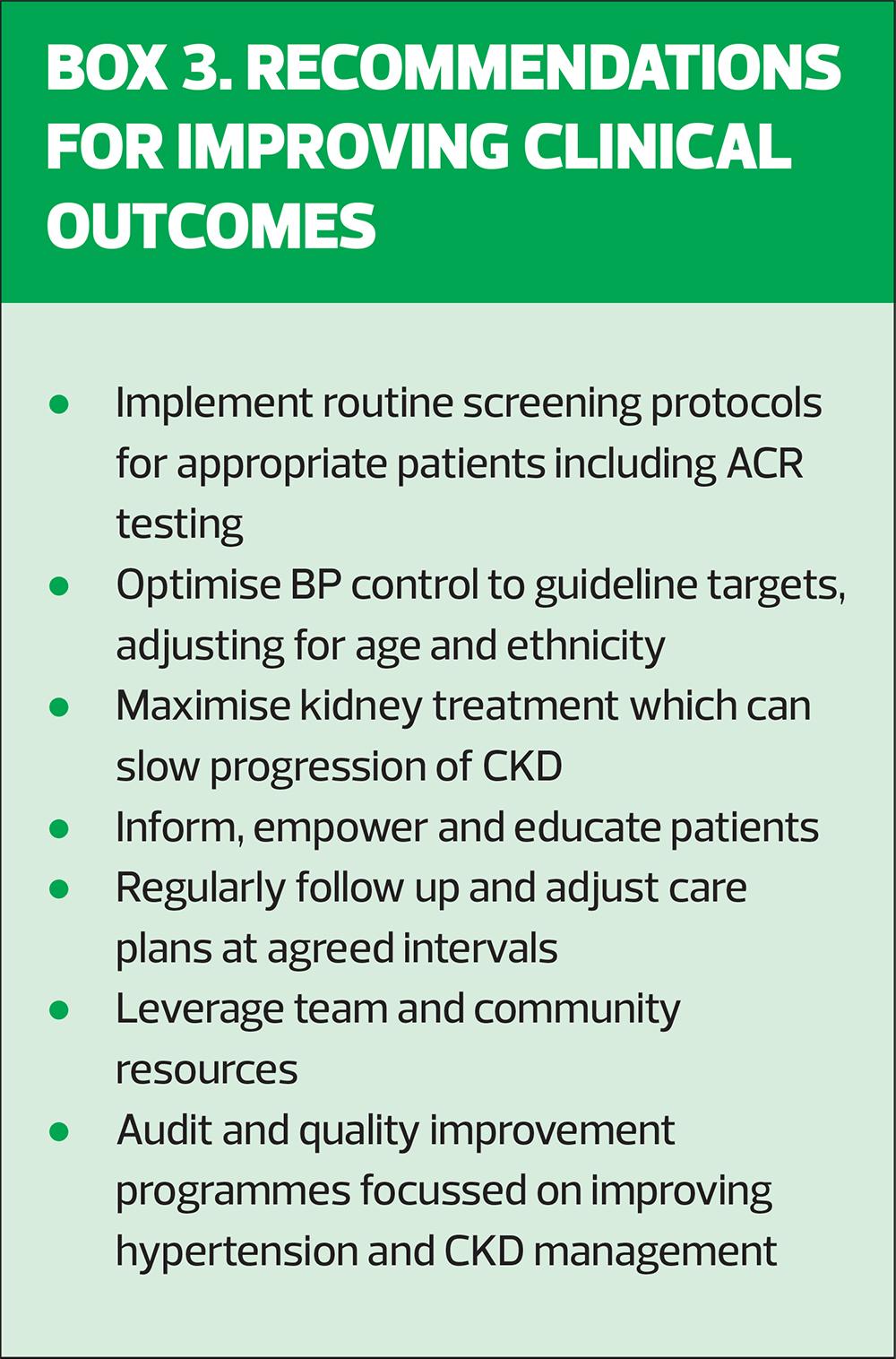 Primary care plays a key role in the ongoing management of hypertension and CKD. Colleagues are well placed to implement simple screening initiatives such as eGFR and urine ACR tests for hypertensive patients as part of annual long term condition reviews. Systematic screening can also help to detect CKD at early stages where intervention is most effective.