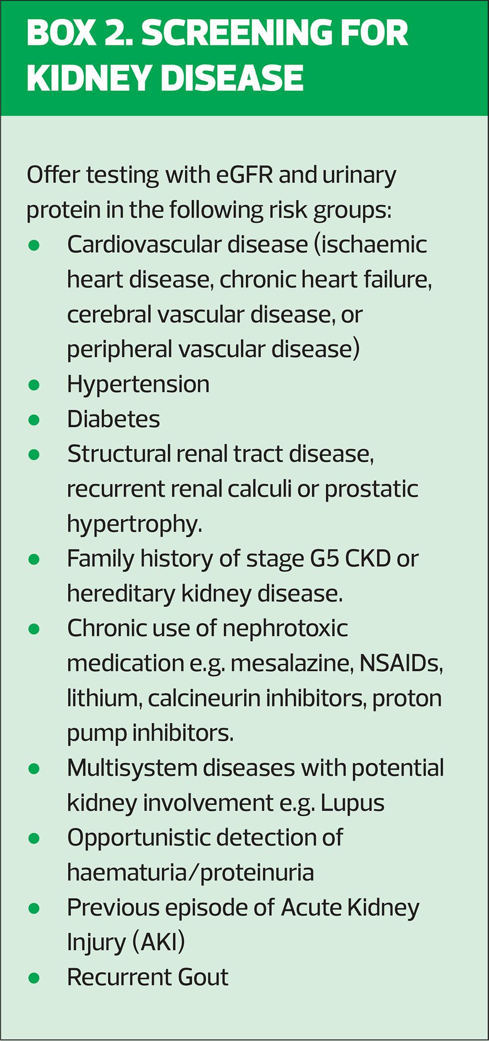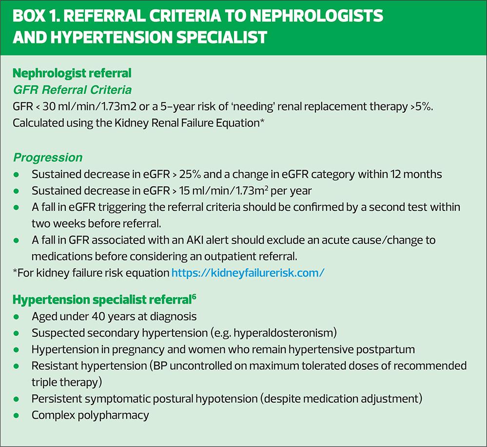 For assessment and early intervention, it is important to consider whether these conditions are driven by any reversible or secondary causes which need further attention. For example, in hypertension, consider lifestyle factors such as salt intake, obesity, stress or secondary causes such as renal stenosis or endocrine causes. This may need specialist referral, particularly if it is difficult to control blood pressure or the patient is young (see Box 2). Specifically to CKD, consider the impact of diabetes, nephrotoxic medications or other systemic causes of renal impairment (e.g. Lupus) and check for haematuria; again, further assessment or management may require a nephrology referral.