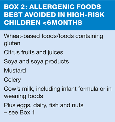It is usually recommended that high allergenic foods should not be introduced to the diet before the age of 6 months, but there is little evidence that delaying their introduction beyond this age is beneficial to babies at risk of allergy. However, it is recommended that such foodstuffs (Box 2) should be introduced one at a time so that if a reaction occurs, the source can be more easily identified.3