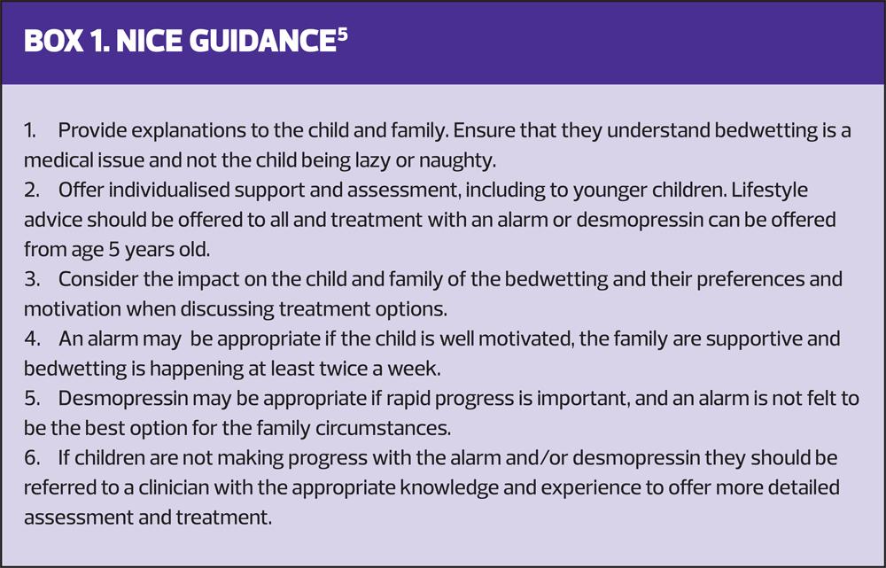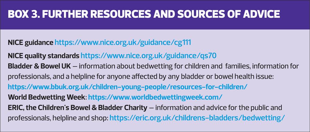 Further resources are available to children, families as well as to clinicians (see Box 3), which may aid understanding and adherence. However, if children are not making progress after treatment with desmopressin and/ or alarm, for any reason, NICE5 is clear that children should be referred to a professional with the appropriate expertise for further assessment and support.