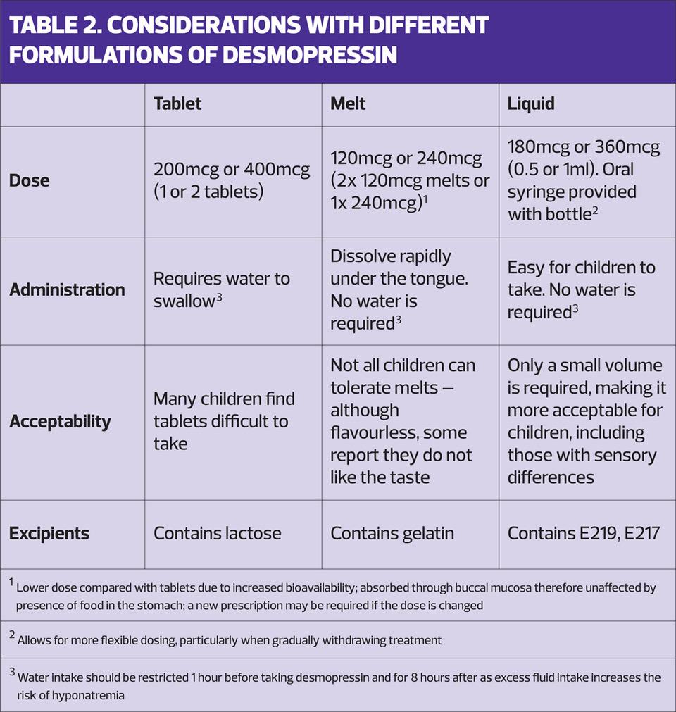 The oral solution of desmopressin is newly available and provides a cost-effective alternative to tablets and melt. It is flavourless and only small volumes are required, which makes it straightforward to swallow and more difficult to spit out. It is also a familiar way of taking medication for many children, and does not contain any common allergens.