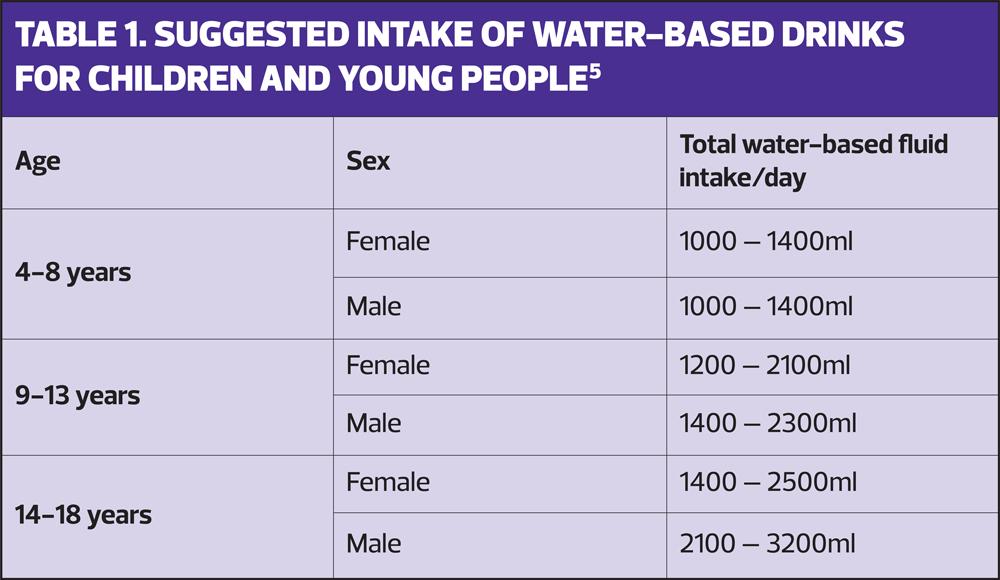 It is usual to exclude and treat any underlying constipation, in line with NICE guidance,23 and encourage behaviours that promote optimal bladder function, as these may lead to resolution for a minority of children. The child should be encouraged to drink water-based fluids at approximately two hourly intervals from waking until an hour before bedtime (see Table 1 for suggested fluid intake). They should avoid caffeinated and fizzy drinks as these may promote diuresis and bladder overactivity. Optimal toileting habits – using the toilet about every two hours and just before settling to sleep – should also be recommended. Ensuring a good position on the toilet with bottom and thighs well supported will help to facilitate complete bladder emptying.3