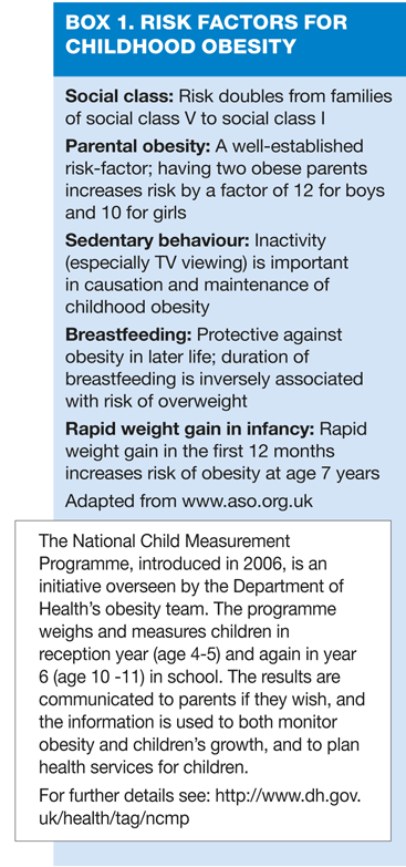 Becoming overweight or obese is the result of consuming more energy (calories) than needed, alongside too little physical activity, although this is a highly-simplified overview. The reason for the increase in childhood obesity is a tangled web of complex factors: individual decisions made by parents and children themselves in the context of human biology, culture, the food environment (plentiful availability of highly palatable and low-cost food) and the physical environment (increasingly sedentary lifestyles, screen time and car usage). In the UK, several risk factors for childhood obesity have been identified (see box 1).3 For almost all obese children, the origin of obesity lies in lifestyle factors; genetic causes of obesity are extremely rare.