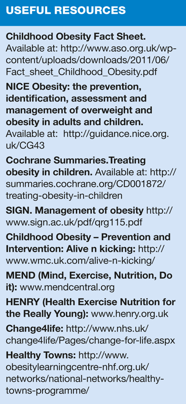 Major reviews of treatments for obesity in childhood (NICE, Cochrane and SIGN, see Useful resources) have failed to show a clear feasible treatment pathway but, as with prevention programmes, a number of common components have been identified. These include :