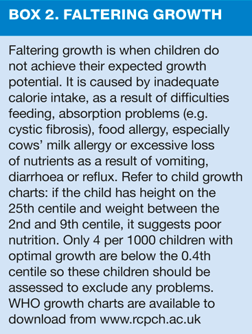 Examine the child for growth and physical signs of malnutrition or faltering growth. (Box 2)