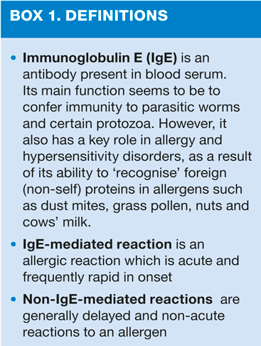 Allergy can be divided into three main types - IgE-mediated, non-IgE-mediated and mixed IgE- and non-IgE-mediated. (Box 1) Which type of allergy is present may be indicated by the type of symptoms that present.1 (Table 1) NICE recommends that practice nurses should consider the possibility of food allergy in children (and young people) whose symptoms do not respond adequately to treatment for: