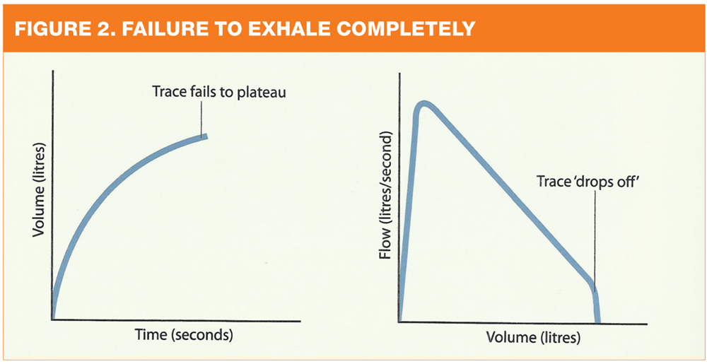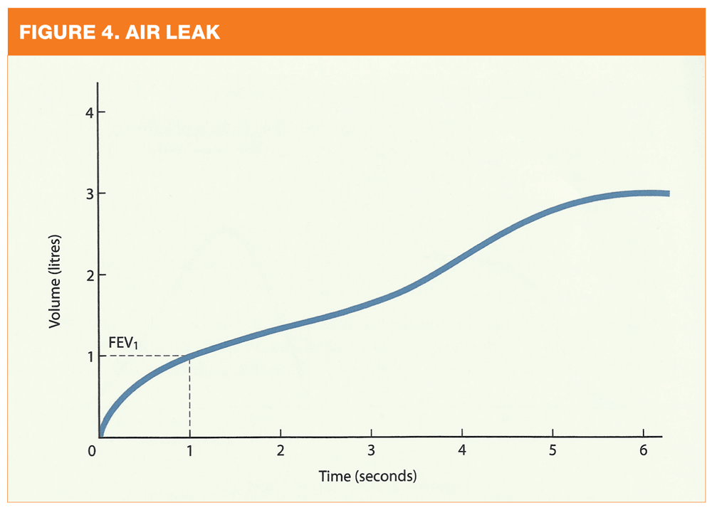 This is a common problem and can give very misleading results if it is not detected. The volume/time trace will fail to plateau and the flow/volume trace will 'drop off' and fail to merge with the horizontal axis. (Figure 2)