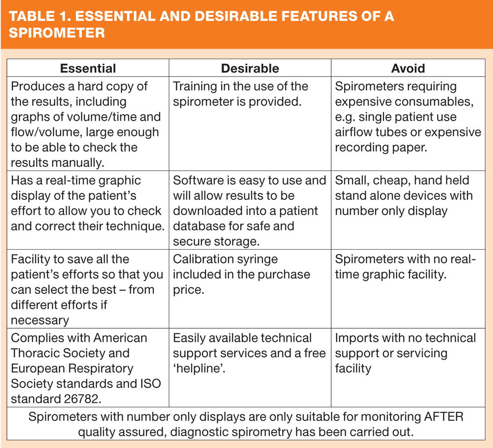 A spirometer should comply with International Standard Organisation standard 26782.5 The essential and desirable features of a spirometer, and those to avoid, are listed in Table 1. Other equipment that will need to be available is listed in Box 1.