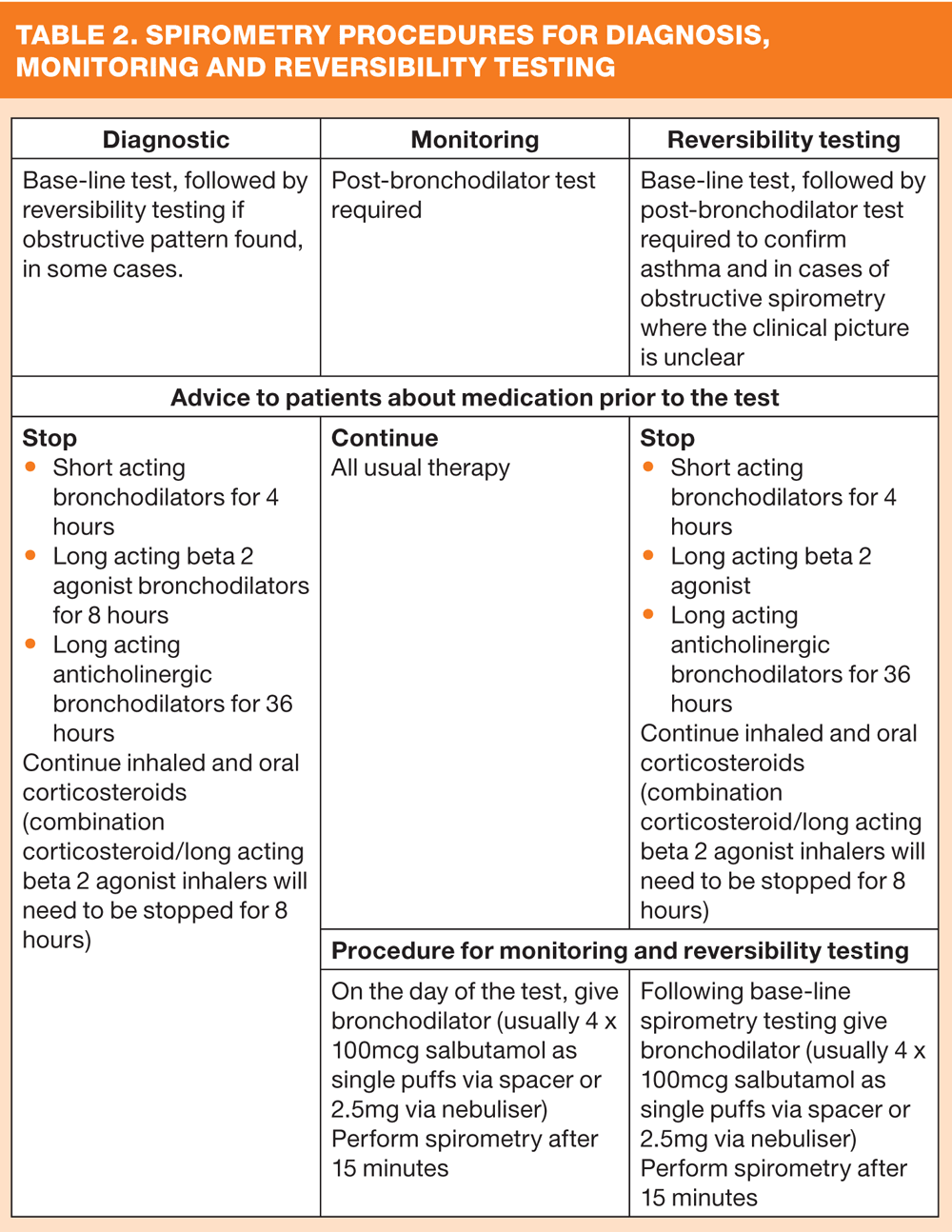 Spirometry can be performed opportunistically but it is helpful to give patients instructions to help them prepare. These will vary according to the reason for doing the test. It will save time, and aid adherence to instructions, if you have information and instruction sheets to give to patients. If you ask them to sign these instructions they can also serve as consent to the procedure.