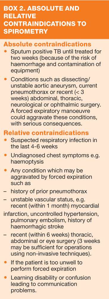 Spirometry is generally safe, but requires patients to make a maximal forced expiration. There are two absolute contraindications and a number of relative contraindications.9 (Box 2)