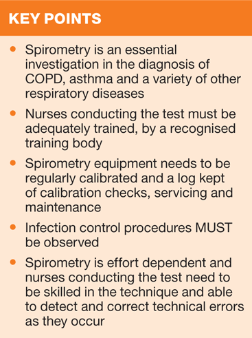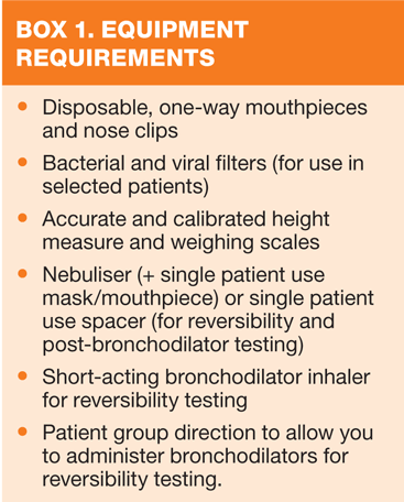 The requirements for safe and accurate spirometry testing will be covered here. The interpretation of the results, beyond checking that the test is technically acceptable and valid, is beyond the scope of a 'primary care essentials' article.