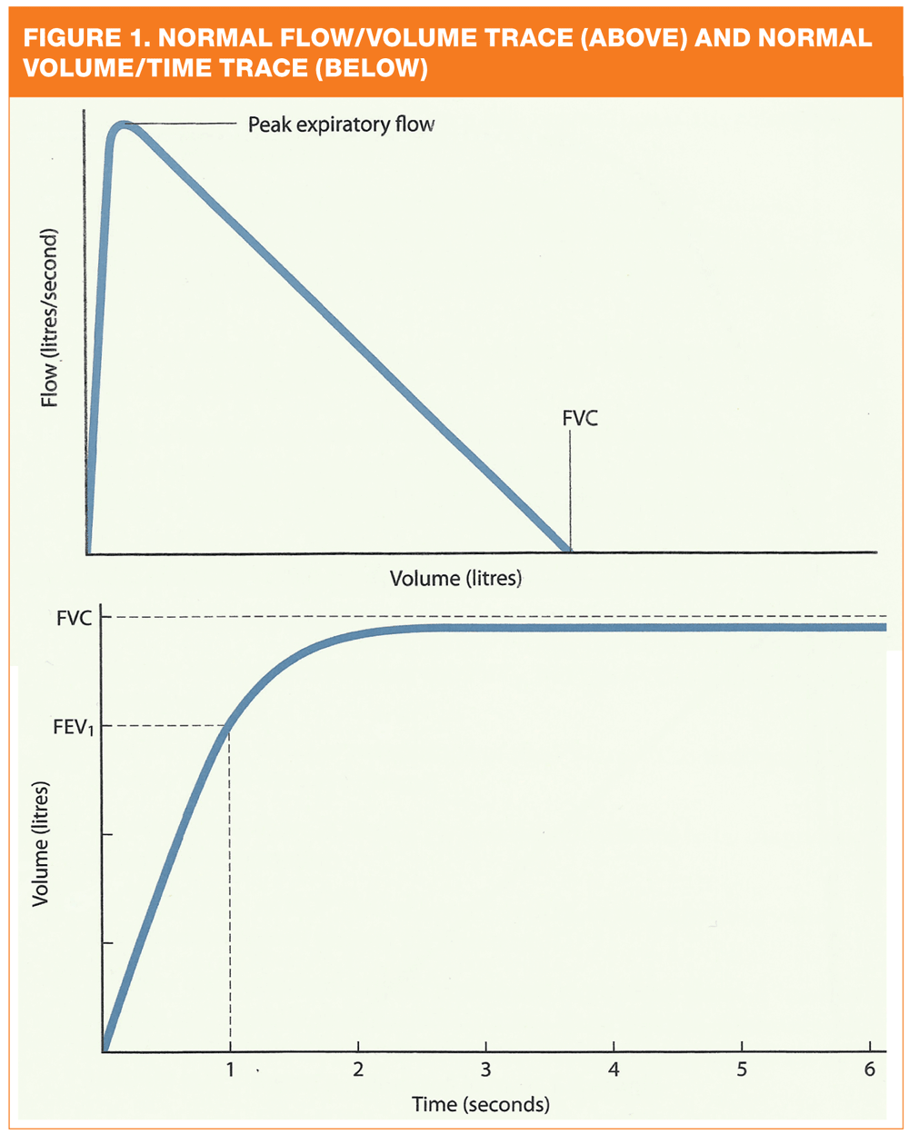 The graph of volume against time, the volume/time trace, should always be smooth and upward curving and should reach a plateau for at least one second. The graph of air flow rate against volume, the flow/volume trace, should rise almost vertically before dropping down to merge with the horizontal axis. Normal volume/time and flow/volume traces are illustrated in Figure 1.
