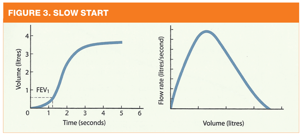 This is another common problem. The patient fails to make a maximal effort at the start of the blow, giving an 'S' shape to the start of the volume/time trace and a flow/volume trace that does not rise almost vertically.(Figure 3)