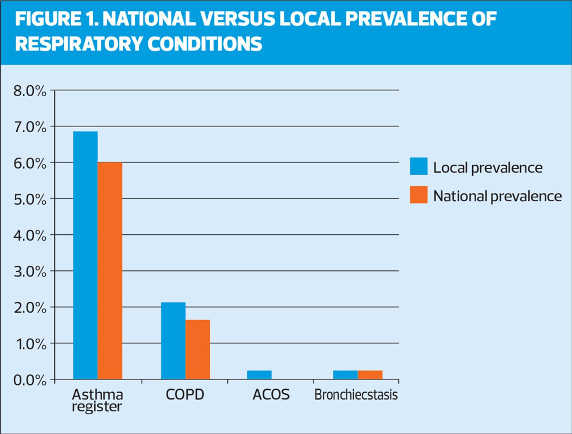 Based on QOF 2015/16 data there was an under-prevalence of asthma, reported as 5.5% versus the national average of 5.9%, and COPD prevalence was equivalent to the national average at 1.6%; however Right Care findings suggested there may be underlying diagnostic and management issues.