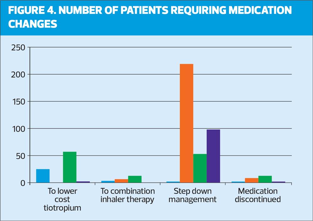 Once registers were cleansed, total potential savings of £117,270.43 were identified for all nine practices using appropriate prescribing (stopping triple therapy, switching to LABA/LAMA therapy, stepping down or switching to a lower cost medication, Figure 4) and using local prescribing guideline management.