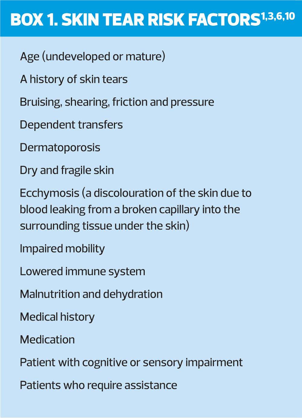 Risk factors for skin tears are summarised in Box 1. The focus on skin tears is usually in the ageing population, yet they are also common skin injuries in infants and neonates whose skin is immature, and when epidermis and dermis cohesion is not robust. In neonates, skin tears are typically associated with devices or adhesives,8,9 and can occur on the head and face as well as extremities.8