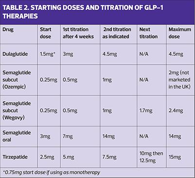 To minimise gastrointestinal (GI) side effects, GLP-1-based therapies should be started at a low dose for a month before uptitrating to the most effective dose for that individual, depending on the indication for use – T2D or obesity. (See Table 2).