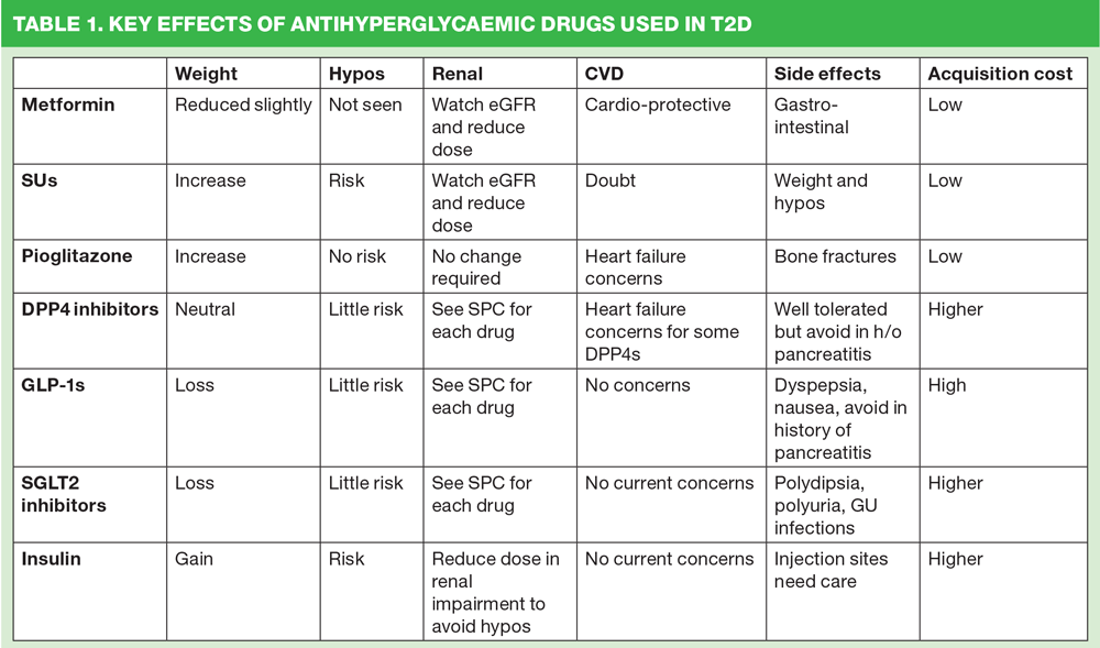 Sulfonylureas (SUs) are often used as the next step up after metformin although they do have some possible side effects, which mean that they are by no means suitable for all. However, their low acquisition cost means they remain a popular choice for many clinicians. They can lower blood glucose quickly and effectively by encouraging the pancreas to produce more insulin, albeit indiscriminately, thus leading to an increased risk of hypoglycaemia. The fast improvement in blood glucose levels can be useful for people suffering from the osmotic side effects of hyperglycaemia such as thirst and polyuria although this improvement is thought to be short-lived in many cases.8 There is much debate as to the cardiovascular effects of SUs with some studies showing a decrease in cardiovascular events while others showing an increase, probably linked to the risk of hypos.9 SUs can be used in renal impairment but consideration should be given to reducing the dose as reduced renal function can lead to higher levels of circulating drug thus increasing the risk of hypos. (Table 1)