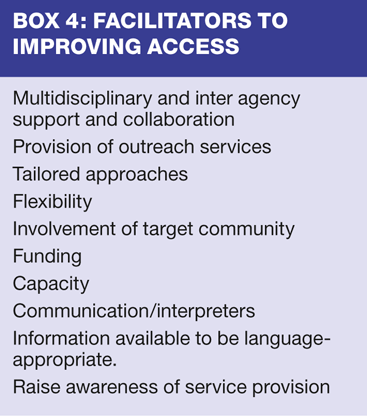 There are a number of facilitators for improving services. (Box 4) Services need to be tailored to the needs of disadvantaged groups and should be flexible, e.g. use of appropriate facilitators in faith centres, community centres and other community-based locations. Support from other professionals, such as community pharmacists, specialist nurses in diabetes, community matrons, expert patient groups, etc. can help drive change.