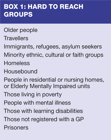 Think about your practice population. Who are the hard to reach groups within your area? (Box 1) This could be a starting point for identifying groups of people who are unable or choose not to access routine services.