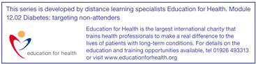 Diabetes is associated with serious cardiac and cerebrovascular disease, as well as small vessel disease that can result in blindness and renal failure.8 It reduces life expectancy by approximately 20 years in type 1 diabetes and 10 years in type 2 diabetes.9 At the time of diagnosis half of those with type 2 diabetes will already have complications.10 Good diabetes management reduces the risk of complications, which is why it is important to make every effort to reach the non-attenders.11,12