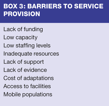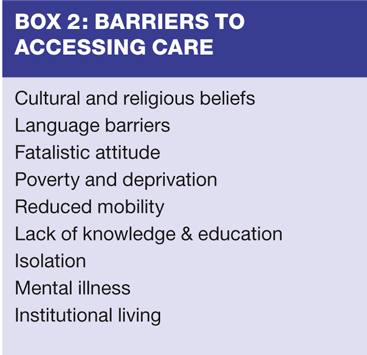Primary care practitioners, particularly commissioners of services, may identify other barriers, e.g. lack of funding and resources, not enough staff to conduct reviews. Many chronic disease management clinics within general practices have become so 'stretched' it is difficult to focus on people that cannot access routine care. District nursing teams do not always have the capacity to conduct routine diabetes reviews. Unless service provision is funded and resourced specifically with the aim of addressing these issues then difficulties will continue.