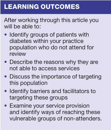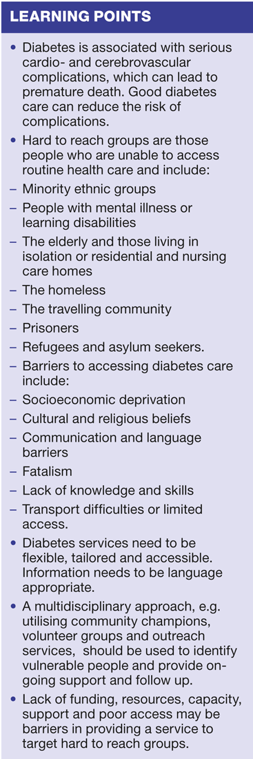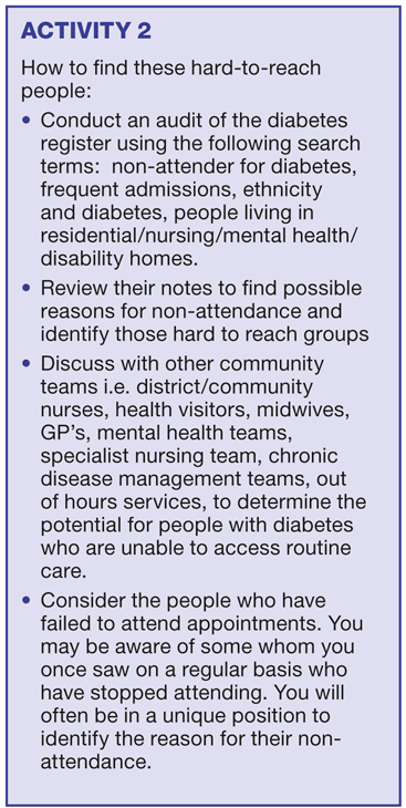 There are approximately 2.8million people in the UK with a diagnosis of diabetes,1 and a further estimated 850,000 who remain undiagnosed.2 Approximately 90% of these individuals have type 2 diabetes,3 the majority of whom are managed in primary care. The Quality and Outcomes Framework (QOF)4 rewards practices for achieving set outcomes for diabetes. This is ideal for those able to access care, either in general practice or via secondary care, but what happens to those who are unable to or unwilling to take advantage of the services offered?