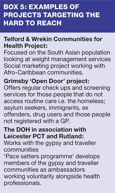 The Diabetes UK website contains examples of good practice, with contact details for projects targeting specific 'hard to reach' vulnerable and/or disadvantaged communities. Table 5 describes just some examples that could be replicated to other areas.