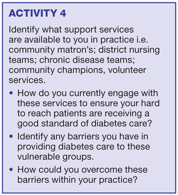 In order to prevent complications and further deterioration of existing disease, vulnerable people with diabetes need to be identified and offered a flexible, culturally sensitive and integrated care service that will address their health care needs. Identifying barriers and facilitators will help the planning and commissioning of new services or identify ways to improve existing services. Clinical commissioning has the potential to allow GP practices, working with other primary and community clinicians, to develop new services for their patients, or improve existing ones to better meet their needs.