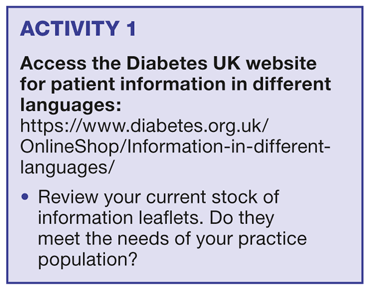 Language barriers create communication problems between clinician and patient. There are organisations that produce leaflets and booklets in numerous languages. There are also interpreters and helplines to assist where language barriers are an issue. We should, however, also consider communication in terms of written information. More than 5 million people in the UK have impaired literacy and/or numeracy skills.26 This can impede communication and be a significant barrier to the fostering of self management skills.