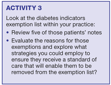 Approximately, one in ten people admitted to hospital have diabetes, of which 60% are emergency admissions.13 Those who are admitted frequently may have been 'missed' from routine care or have difficulty accessing it. An audit of your 'frequent flyers' may highlight those that do not attend the practice and may also be the evidence needed to facilitate new services, or improve existing ones in order to prevent future ill health and avoid further admissions.