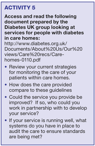 Diabetes UK appointed a group to look at services for people with diabetes in care homes and develop good clinical practice guidelines. These provide a framework of evidence-based, practical and implementable diabetes care recommendations within this setting. It includes diabetes education as part of care home staff training.28