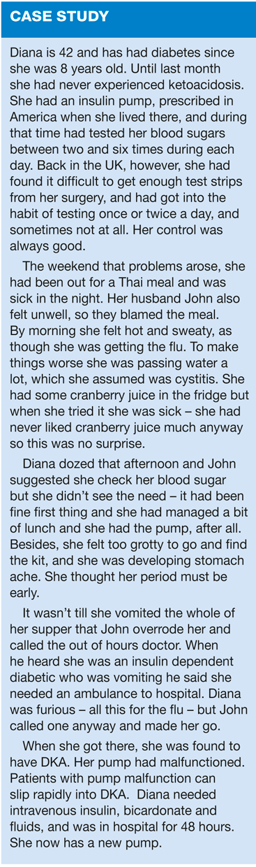 Diabetic ketoacidosis (DKA) consists of hyperglycaemia (above 11.0mmol/l, although it may be very high), ketonaemia (from the breakdown of fats instead of sugar) and metabolic acidosis. It usually occurs when the patient's insulin requirement is not being met. It is more common in people with type 1 diabetics, younger patients and women, and can be the presenting feature of new diabetes. It may occur in patients with insulin pumps if the pump malfunctions, and even experienced type 1 diabetics may assume the symptoms indicate something else. Signs and symptoms of ketoacidosis include an extremely dry mouth, nausea and vomiting, shortness of breath and fruity-smelling breath.