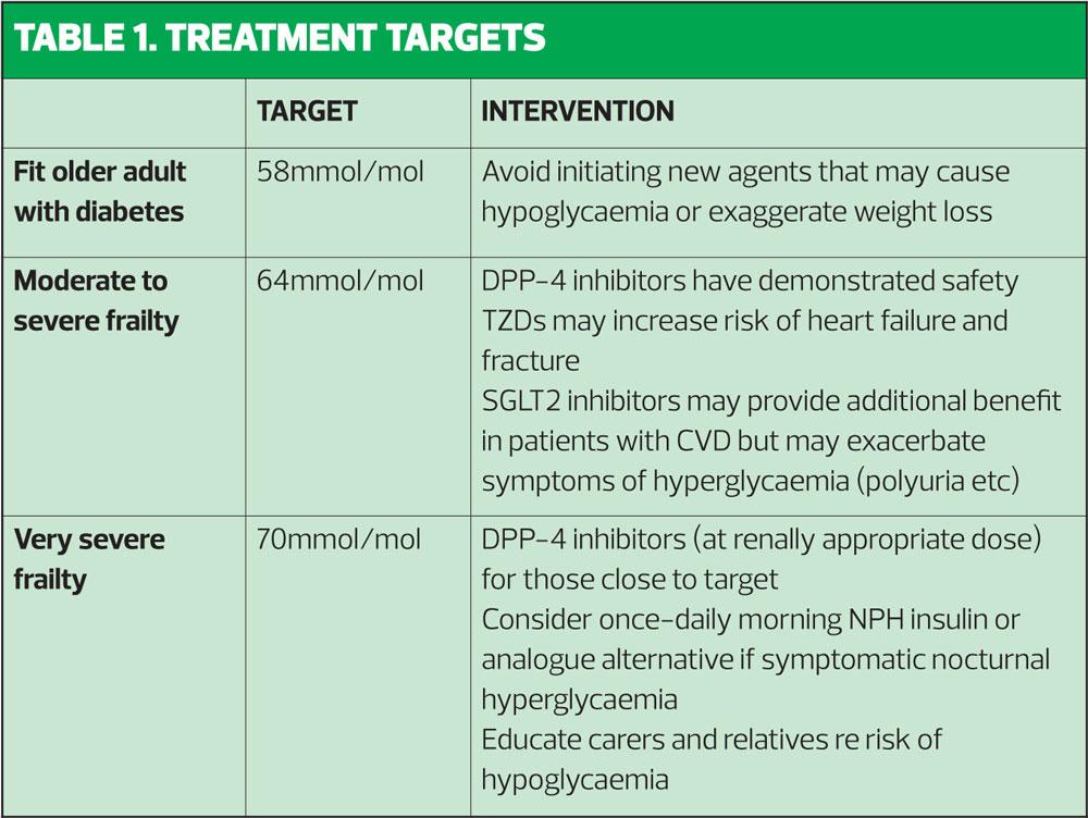 The management of older people with diabetes is often inadequate and inappropriate because it fails to take account of the complexity of their condition and comorbidities, age-related physiology and the risk of iatrogenic adverse drug reactions.1 Older patients should be assessed for frailty as part of their annual review, and this should influence their future management in terms of treatment targets and choice of glucose-lowering medication.