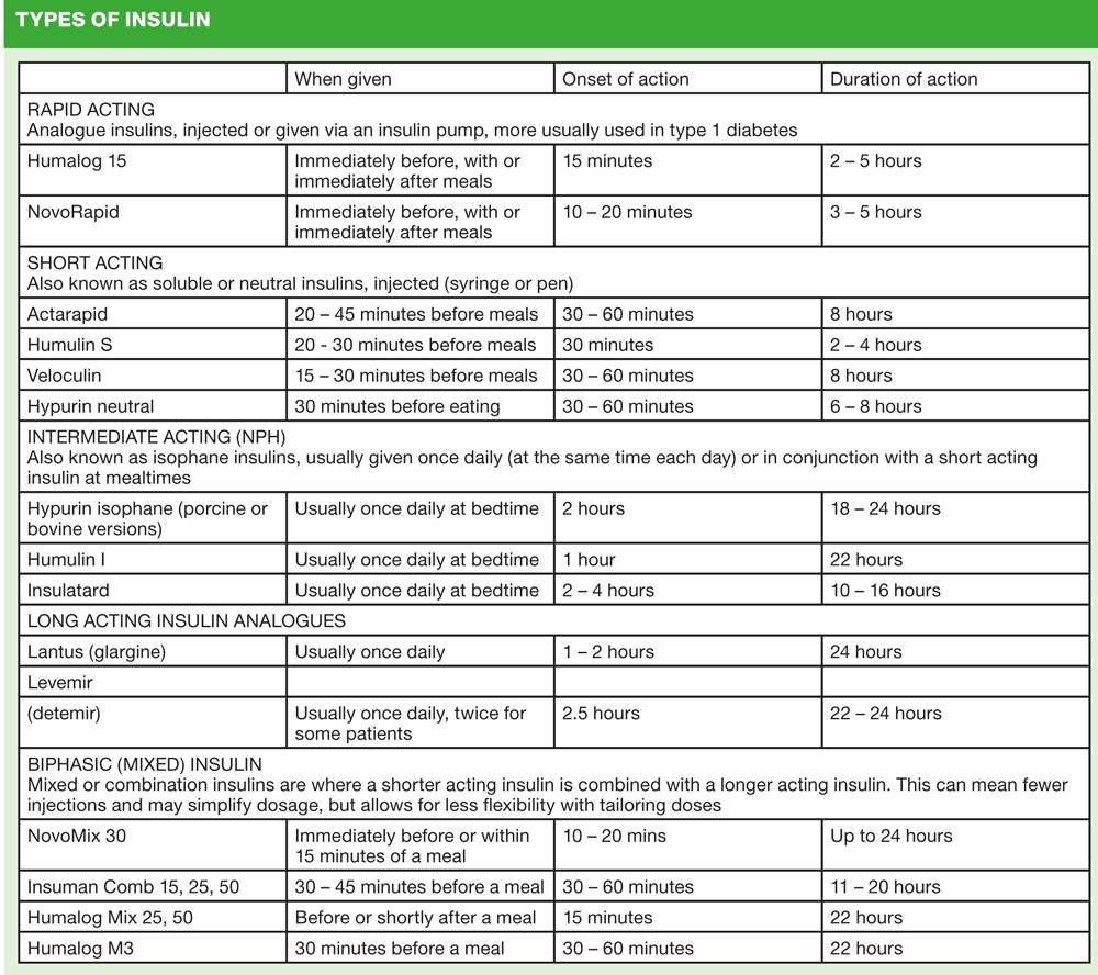 - Short acting human insulins, with fairly fast onset (30 minutes) and short length of action e.g. Actrapid