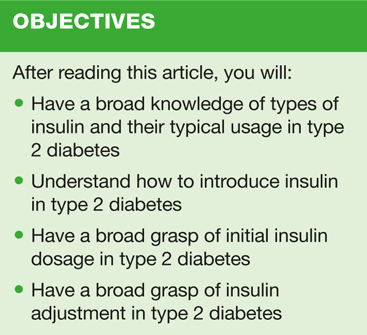 The best treatment for patients is arrived at taking many factors into consideration including their weight, age, state of general health, personal preferences and coexisting morbidities.1 This is no less true when it comes to initiating insulin in patients with type 2 diabetes (T2D). For this reason it is an area where the nurse who gets to know her practice diabetes population can be an invaluable resource both for patients and for the primary care team. Those who take on this work will usually have done added training in diabetes, and in most areas there is also recourse to a specialist diabetes nurse.