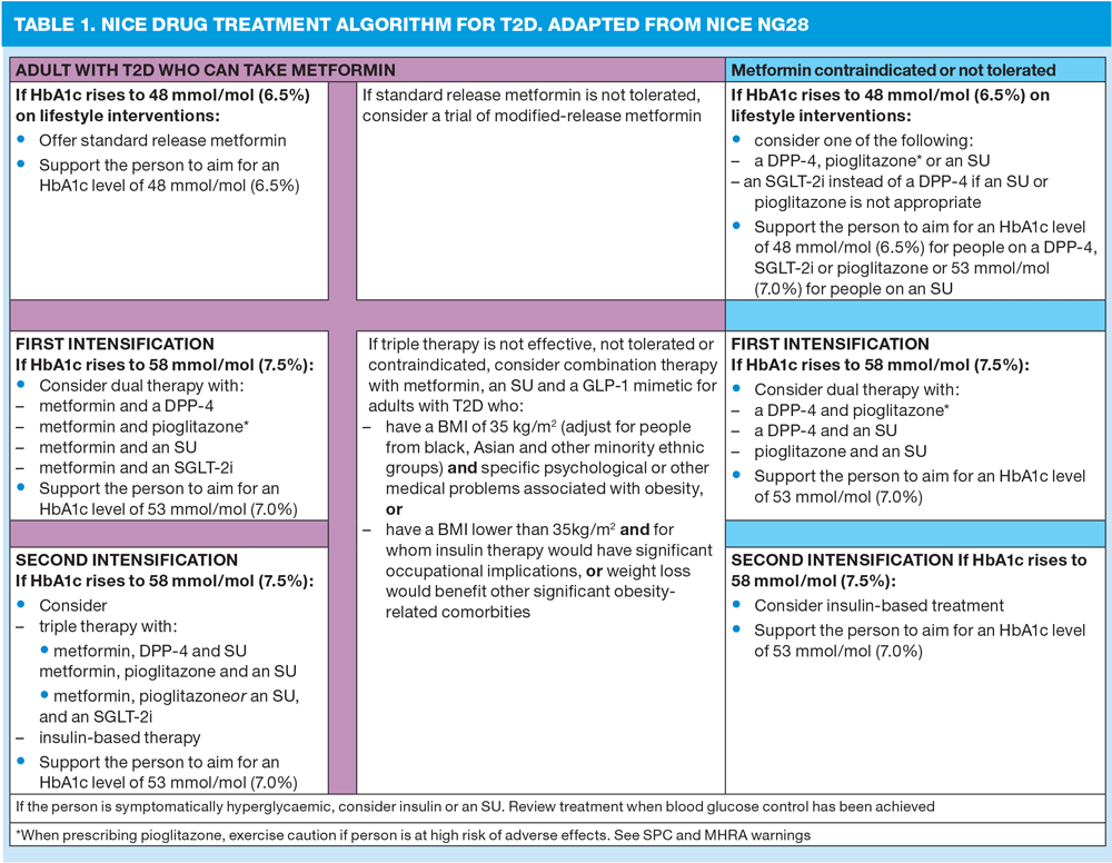 NICE reiterates its previous advice that metformin should be the first line oral hypoglycaemic agent unless contraindicated (rather than not tolerated). In cases where it is contraindicated (for example if the eGFR is less than 30ml/min) then a DPP4 inhibitor, pioglitazone or a sulfonylurea may be considered (assuming the contraindication to metformin is not also a contraindication to one of these drugs, of course). For cases where people cannot tolerate metformin, usually because of gastrointestinal side effects, NICE has retracted its advice in the draft guidance and has now endorsed the use of modified release metformin. The new guidance does remind clinicians, however, that gentle titration of metformin is likely to improve tolerability. This often means starting a patient on 1 tablet daily with a meal for the first week and then increasing to 1 tablet twice daily if the patient is not suffering any ill effects. Repaglinide is another option for people who cannot tolerate metformin, but this is rarely used as it has to be taken three times a day with meals and can also prove problematic if further intensification is needed due to licence limitations.5 Repaglinide featured highly in the draft guidance but has rightly been demoted in the final version because of these issues.