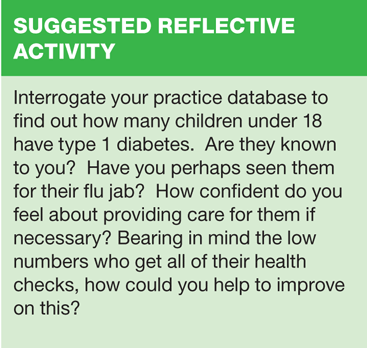 In general practice, Sarah’s mum has experienced problems with staff having limited knowledge of type 1 diabetes and not understanding the basics of insulin use, especially pump therapy; she has also been questioned about her high use of blood glucose testing strips. On one occasion Sarah’s insulin was incorrectly transcribed from her hospital discharge letter to the general practice records, which could have been potentially dangerous although fortunately Sarah’s mum recognised the error and notified the practice and the pharmacist. However, Sarah’s parents are very aware that primary care has a lot to deal with and that staff may not have much experience with type 1 diabetes, especially in such a young child.