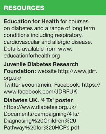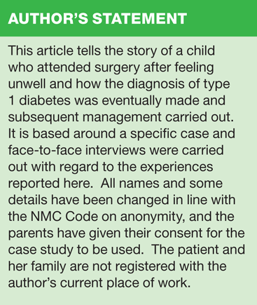 Sarah’s case is just one story, and many children with type 1 diabetes will have a far less traumatic tale to tell of their diagnosis and management. However, with the increasing number of children presenting with type 1 diabetes and DKA primary care needs to be vigilant. According to Diabetes UK’s report ‘State of the Nation 2013,’11 the specialist care that children with type 1 diabetes require is not routinely in place in all areas and this puts these children at high risk of developing complications later on in life. The UK is currently one of the worst performing countries in Europe in terms of glycaemic control for children with diabetes with 84% of children being poorly controlled. Furthermore less than 6% of all children over the age of 12 have all of the key checks recommended: HbA1C; body mass index; blood pressure; urinary albumin; blood creatinine; cholesterol; retinal screening and a foot examination. Sarah’s parents have nothing but praise for the care and support offered by her DSN and consultant but also find online support via specialist websites such as that provided by the Juvenile Diabetes Research Foundation and social media networks invaluable. Arguably further input and support is needed for parents and patients with type 1 diabetes and, as more and more care is delivered in primary care, it could be argued that clinicians in general practice need to increase the level of service they offer as the first port of call, both in terms of recognising children at risk and being able to support parents and patients with type 1 diabetes throughout their journey.