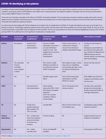 The Primary Care Respiratory Society (PCRS-UK) has produced ‘Pragmatic Guidance for crisis management of asthma and COPD during the UK COVID-19 epidemic’, which states: ‘Now, more then ever, it is essential we ensure patients with asthma and COPD are managed according to the latest clinical guidance.’